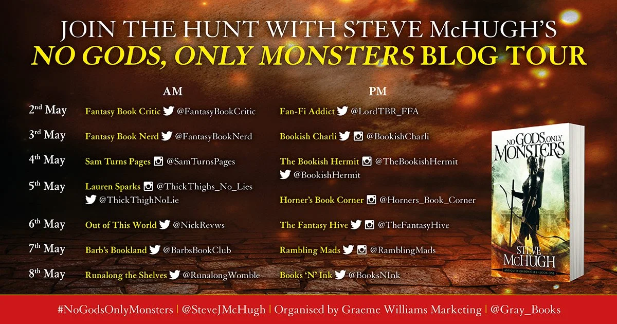 Today I am on the blog tour for No Gods, Only Monsters by Steve McHugh that tells the tale of Diana the Roman goddess of the hunt called back from her isolation to help an old friend and then the adventures start. I’ll review soon but today Steve McHugh was able to talk about how their approach to action scenes